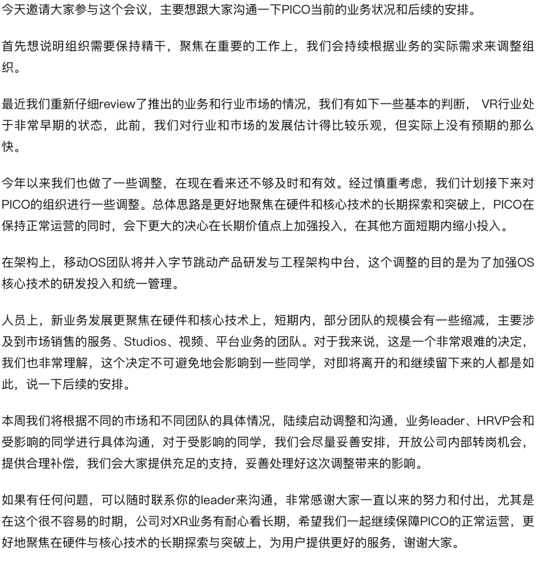 11月7日,字节跳动旗下VR部门PICO发布内部通知,宣布进行裁员,并对组织架构进行调整,其中,PICO移动OS团队将并入字节跳动产品研发和工程架构中台,以加强OS核心技术研发的中台投入和统一管理。