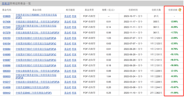 邢秋羽现管理的基金中,所有的基金产品任职回报都是负收益,5只基金(多种份额单独计算)任职期间基金净值跌幅超过10%,最佳任职回报为-1.72%。