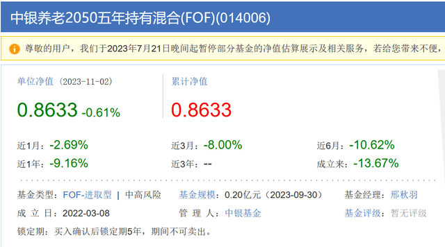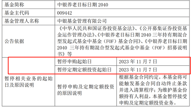 此外,在发布该基金可能触及清盘风险提示公告的同时,中银基金还发布了一则暂停申购的公告,从2023年11月7日起,中银养老目标日期2040暂定申购及定期定额投资,原因是该基金可能触及清盘风险。