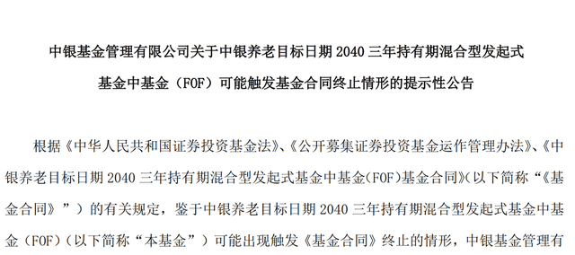11月7日,中银基金发布了关于中银养老目标日期2040三年持有期混合型发起式基金(下称“中银养老目标日期2040”)可能触及基金合同终止运作的情形的提示性公告。