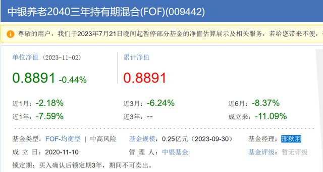 资料显示,中银养老目标日期2040成立于2020年11月10日,基金设有三年的持有期限,投资者在申购该基金后,最短需要持有三年才可以赎回,该基金的基金经理为邢秋羽。