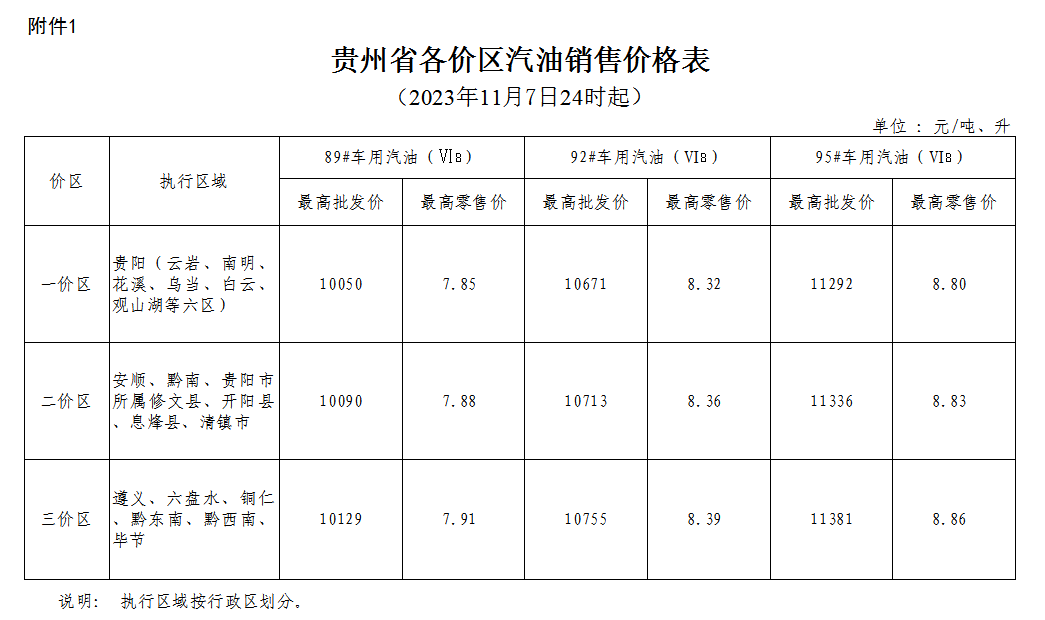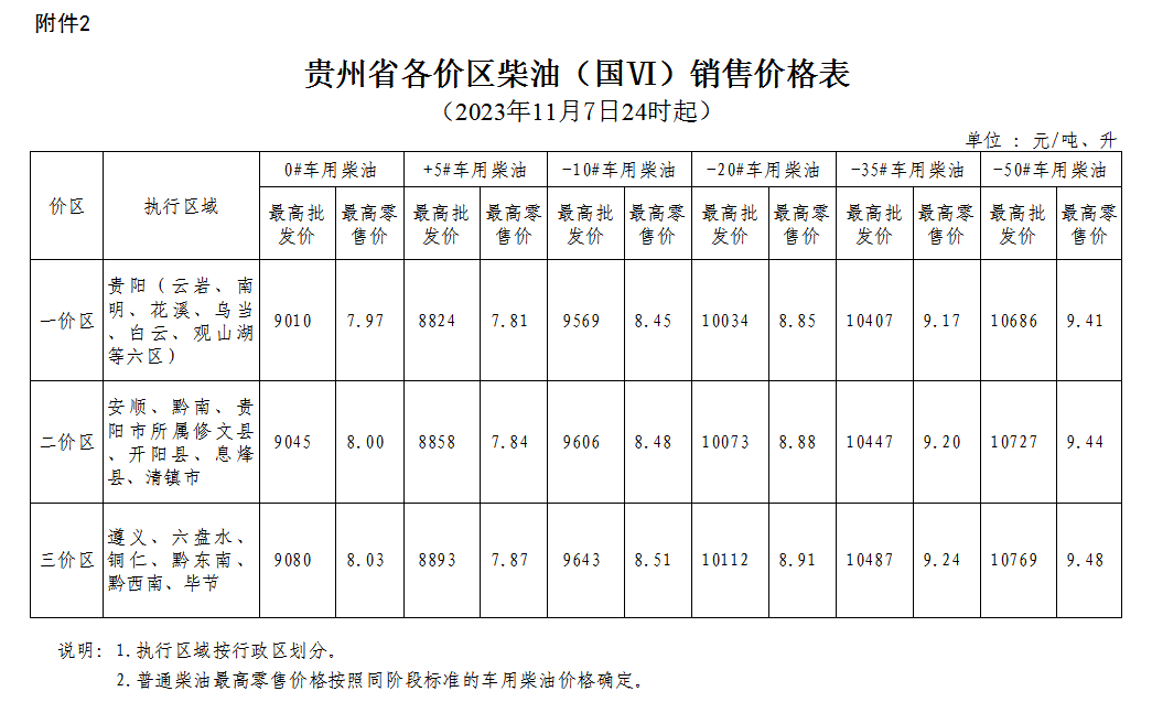 根据国家成品油价格形成机制,国家发展改革委决定自2023年11月7日24时起下调国内成品油价格。按照国家调整要求和相关规定,贵州省89#汽油(国VIB)、0#柴油价格每吨在现行标准基础上分别降低140元和135元,具体价格可由各经营企业在不超过最高批发、零售价格的前提下确定。调整后各油品最高价格见附件。