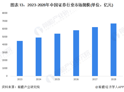 随着我国经济逐步复苏、美联储加息周期进入尾声以及地缘冲突的缓和,前瞻预计我国证券业营业收入规模在未来几年将持续增长,到2028年,我国证券市场规模有望达6667亿元。