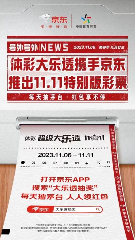京东11.11“真便宜”消费体验再加码。近日,京东携手中国体育彩票推出“京东11.11 全民大乐透”活动,为全民“添彩头”。购买11月6日、8日和11日开奖的体彩超级大乐透,即可参与抽奖,每天均有机会赢取茅台、网球拍、羽毛球拍以及大额红包等幸运好礼。