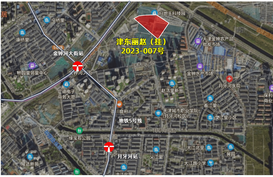 津东丽赵(挂)2023-007号,该地块为东丽区金钟河大街南侧片区城市更新项目8号地块,位于东丽区上江北路与赵沽里大街交口西北侧,其四至为:东至赵沽里大街,西至规划公园绿地,南至上江北路,北至规划变电站及公园绿地。