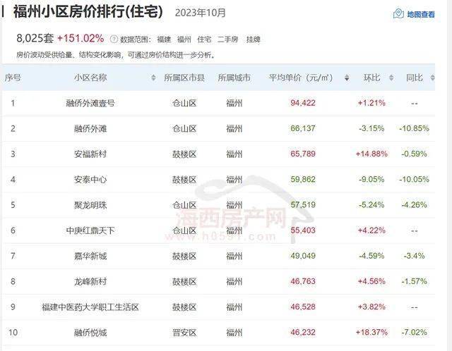 10、融侨悦城:平均单价46528元/㎡、环比上涨18.37%、同比下跌7.02%。