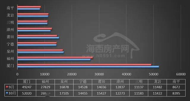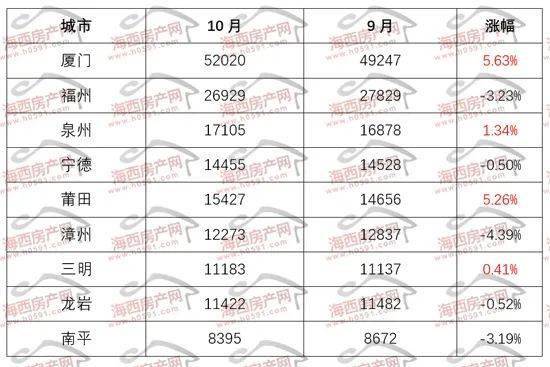 上涨的四个城市分别为厦门、泉州、莆田、三明,10月房价分别报出52020元/㎡、17105元/㎡、15427元/㎡和元/㎡,涨幅分别为5.63%、1.34%、5.26%和0.41%。
