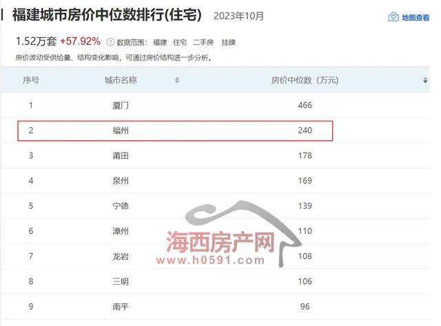 通过上图可以看到,10福建城市房价中位数排行(住宅)当中,厦门、福州房价中位数分别报出466、24万,位列前两位。其中,福州环比9月上涨10!
