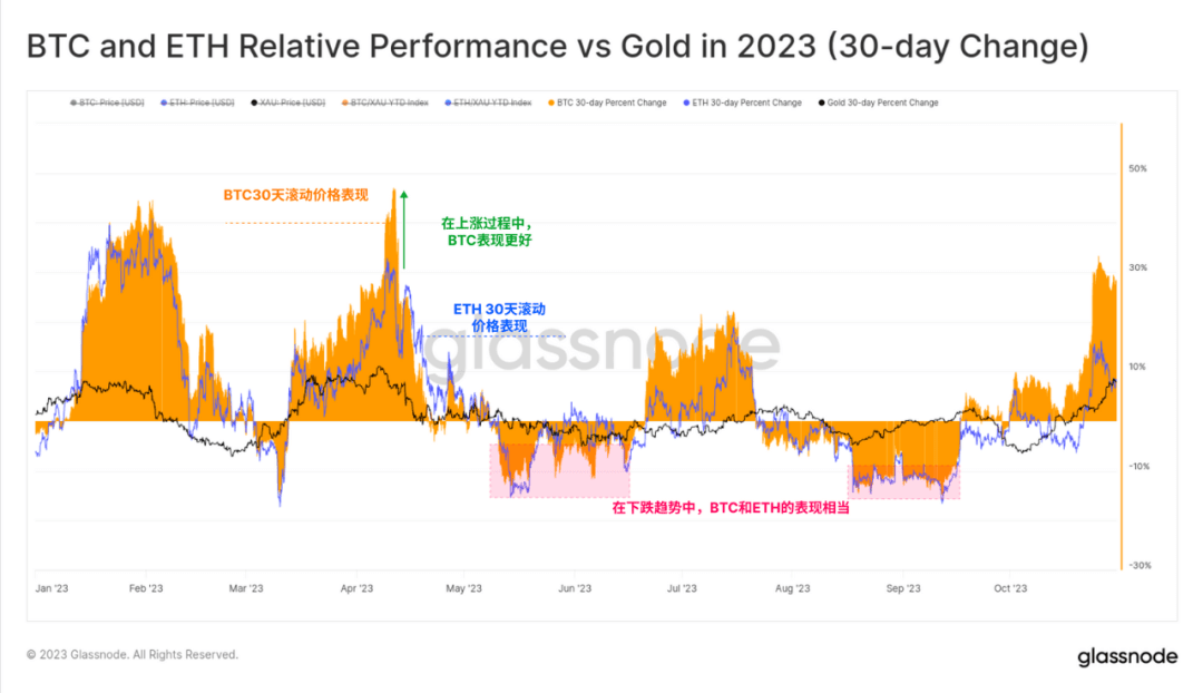 我们可以看到,基于滚动的 30 天基准,BTC 和 ETH 的回报在 2023 年内一直紧密相关。两种资产都经历了类似幅度的下跌,但比特币在上涨期间表现更为强劲。