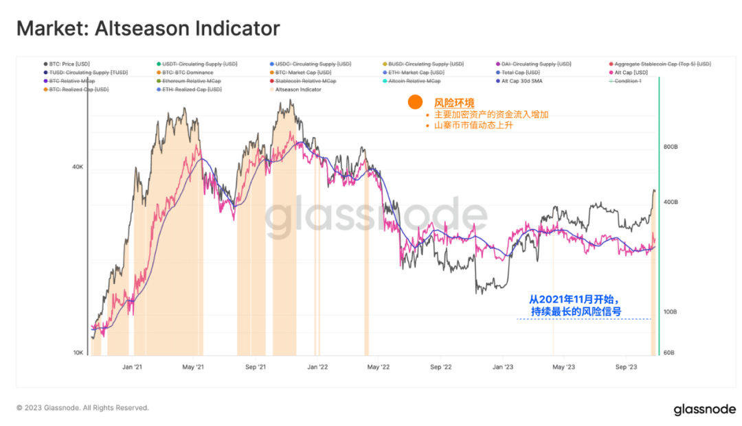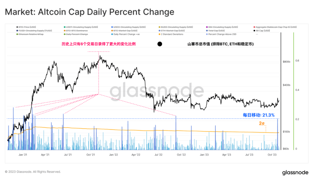 在这里,我们要寻找山寨币总估值大于其 30D SMA 的时期。在比特币从 2.95 万美元暴涨至 3.5 万美元之前,该指标在 10 月 20 日显示为正值。