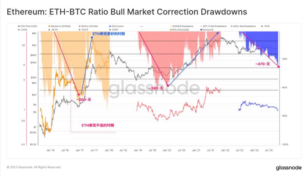 先前的周期已经看到在熊市恢复阶段,ETH 基于相对基准回撤超过 -50%,当前的回撤达到 -38%。尤其值得关注的是这一趋势的持续时间,ETH迄 今已经相对 BTC 贬值超过 470天。这凸显了周期之间的潜在趋势,即在熊市后的宿醉期,BTC 的主导地位会在更长的时间内增强。