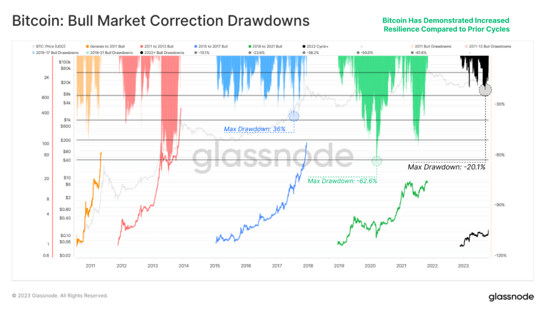 BTC 的表现也可与之媲美,其在 2023 年的最深回撤仅为 -20.1%。2016-17 年的牛市经常出现超过 -25% 的修正,而 2019 年则从 2019 年 7 月的最高点 $1.4 万回撤超过 -62%。