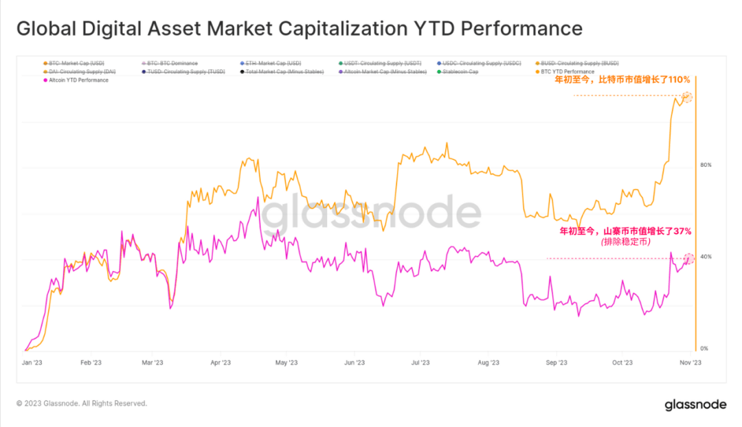 最后,我们可以比较一下比特币与总的山寨币市值(不包括稳定币)的年增长率。比特币市值在 2023 年增长了 110%,而山寨币市值增长了 37%,增幅惊人,但相对较小。