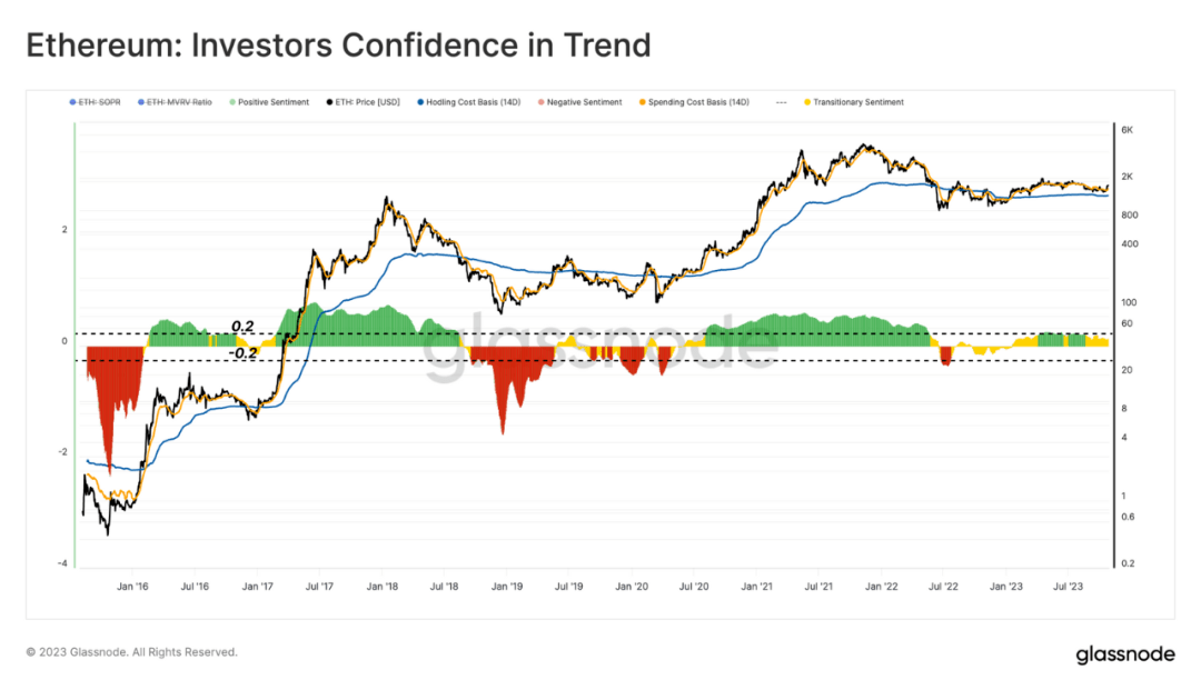 我们还可以利用 "投资者对趋势的信心"(Investor Confidence in Trend)指标来衡量以太坊投资者盈利能力的相对表现。我们试图通过比较持币者和出售者成本基准之间的差异,来判断以太坊投资者情绪的变化。