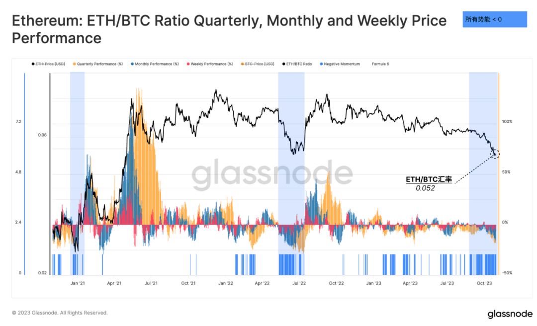 该图从另一个角度展示了 ETH/BTC 比率的相对表现,显示了 ETH/BTC 比率的季度、周和周滚动投资回报率的震荡指标。然后,一个条形码指标(蓝色)突出显示了所有三个时间框架都显示 ETH 相对于 BTC 表现不佳的时期。