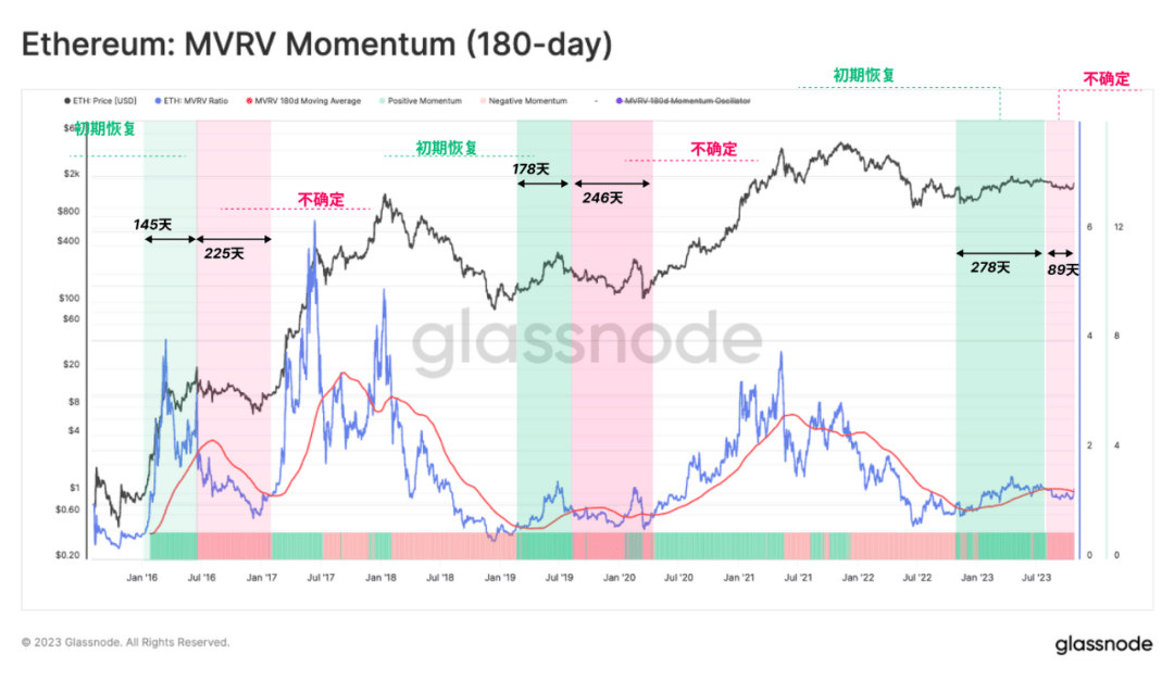 当 MVRV 比率高于这一长期均值时,表明投资者的盈利能力正在显著提高,这通常是市场上涨的信号。然而,尽管 ETH 在今年年初的市场表现良好,但根据这一指标,市场仍处于负面势头状态。看来,2022 年熊市的余波仍在慢慢消散。