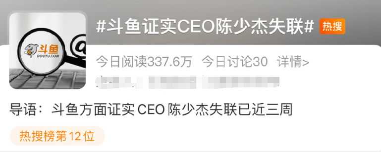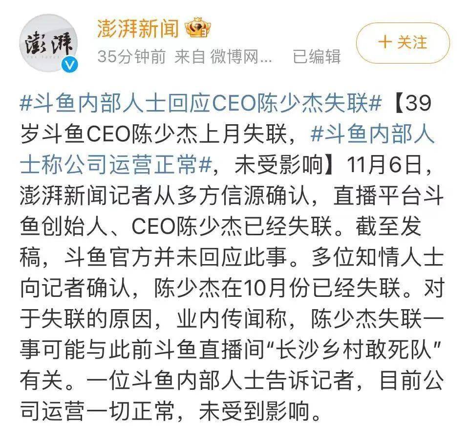 另据澎湃新闻,11月6日,记者从多方信源确认,直播平台斗鱼创始人、CEO陈少杰已经失联。截至发稿,斗鱼官方并未回应此事。多位知情人士向记者确认,陈少杰在10月份已经失联。