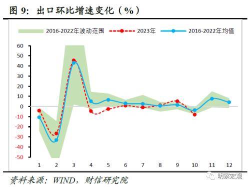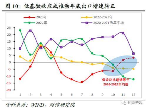 一是低基数效应决定四季度出口同比读数回升,年底增速或转正。受外需放缓影响,10月份出口环比增速低于2016-2022年同期均值较多,但在11-12月份出口环比增速与2016-2022年同期均值相同的情景假设下,预计出口增速大概率于11月份转正,四季度约增长-0.5%,全年增长-4.5%左右(见图10)。