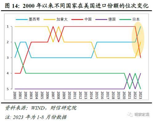 四是全球产业链重构或使我国出口份额成下降趋势,但全产业链优势、贸易伙伴多元化以及出口结构持续优化,将对出口份额形成一定支撑。其一,当前我国外部环境更趋复杂严峻,西方国家产业链“去中国化”风险上升,这可能会加快全球产业链重构,对我国出口贸易形成拖累,不利于我国出口份额的提升(见图14);其二,面对全球地缘政治风险提高局势,产业链供应链的稳定性或日益稀缺,我国全产业链以及成本优势,将对国内出口份额形成一定支撑。其三,近年来我国贸易伙伴不断拓展、贸易结构持续优化,有效提高了我国应对全球供应链和市场波动的能力,或对出口份额也形成一定支撑。