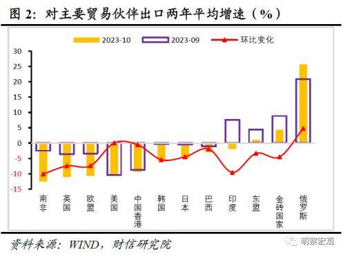 一是分国家看,对欧日韩和东盟出口回落,但对美出口相对平稳。考虑到去年四季度基数效应影响较大,为更好观测对主要贸易伙伴出口增速的变化,我们重点分析剔除基数效应后两年平均增速的情况。10月份对东盟、欧盟、美国、日本、金砖国家、中国香港的出口两年同比增长1.0%、-10.8%、-10.4%、-5.0%、4.3%、-9.4%,增速较9月份分别变化-3.4、-7.4、0.1、-4.5、-4.5、-0.6个百分点(见图2),对欧日韩和东盟出口增速均回落较多,是低基数下出口增速降幅继续扩大的主要原因,反映出外需放缓;对美出口相对平稳,主要受近期中美关系缓和影响;对俄罗斯、东盟出口两年平均录得正增长,且对俄罗斯出口继续回升,反映出贸易伙伴多元化对国内出口形成一定支撑。