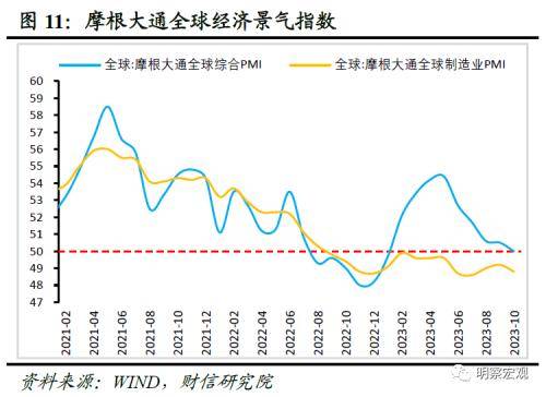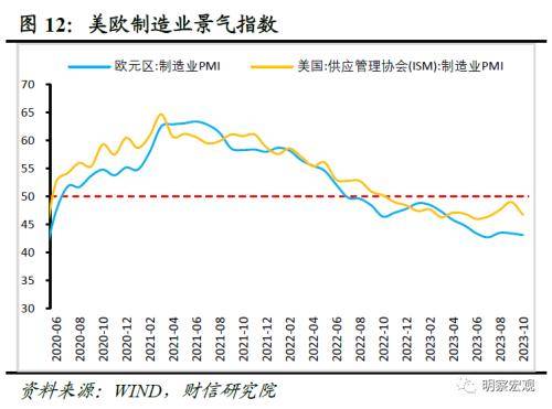 二是预计外需放缓将继续对出口数量形成拖累。其一,10月份摩根大通全球综合PMI、全球制造业PMI指数录得50.0%、48.8%,分别较9月份回落0.5和0.4个百分点,前者降至荣枯线上,后者则连续14个月处于收缩区间,这意味着全球需求持续放缓(见图11)。分地区看,10月份美国、欧元区制造业PMI指数分别录得46.7%、43.1%,较上月回落2.3和0.3个百分点,均继续位于收缩区间(见图12),说明受货币累积紧缩效应显现、地缘政治关系紧张、高利率环境加剧金融风险等因素影响,美欧等发达经济体经济下行压力较大。