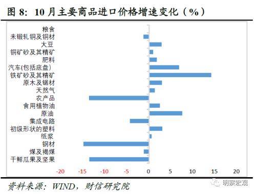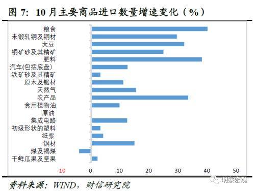 国内需求企稳向好,主要商品进口数量均回升较多。分产品看,10月份进口数量增速环比提高的品种由上月的5种提高至16种,且边际回升斜率有所加快,国内需求企稳向好,且恢复面不断扩大,是进口数量增速回升的主因。