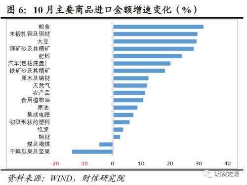 二、低基数和内需恢复共同带动进口增速转正。去年10月份进口增速环比有所回落,低基数效应是进口增速回升的原因之一。从进口量和价看,主要商品进口数量增速环比多数回升,且回升幅度明显高于进口价格,说明数量因素是进口增速回升的主要支撑;本月进口数量增速环比提高品种增多,且回升斜率加快,说明国内需求企稳向好,且恢复面有所扩大。