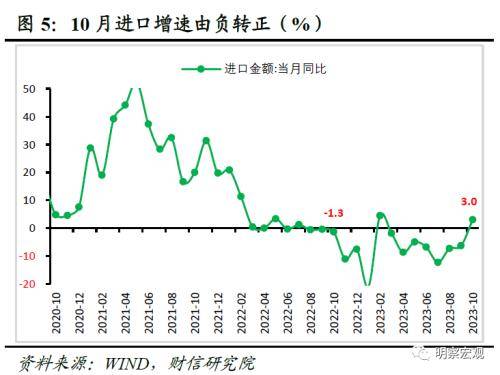 10月份进口金额同比增长3.0%,较上月提高6.3个百分点(见图5),为年内第二次录得正增长。从基数效应看,2022年10月份进口同比下降-1.3%,较前值回落0.9个百分点,低基数效应能部分解释进口增速的回升。