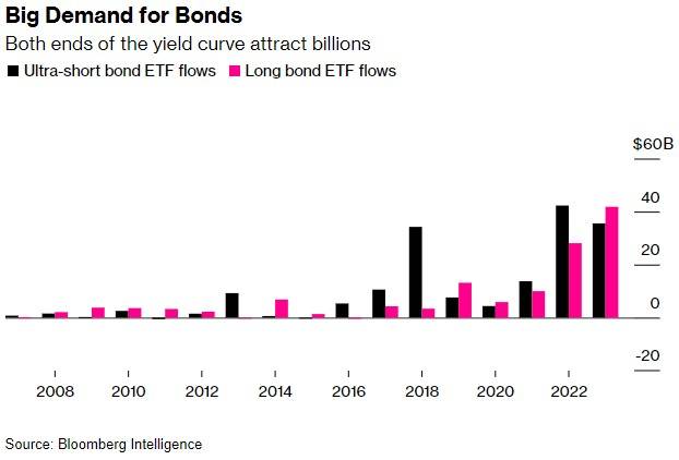 今年,创纪录的大量现金涌入美国国债收益率曲线的两端,要么寻求抓住20多年来最高的短期利息支付,要么寻求在利率最终见顶后从长期债券的反弹中获利。不同的赌注似乎都将同时获得回报。