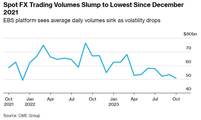 芝加哥商品交易所(CME)的数据显示,外汇交易量已降至两年来的最低水平,因为市场平静,投资者几乎没有理由进行交易。上个月,CME的外汇即期交易平台EBS的日均交易量为508亿美元。这也是自2017年开始报告活动以来的第三低数据,而2021年初的数据约为750亿美元。