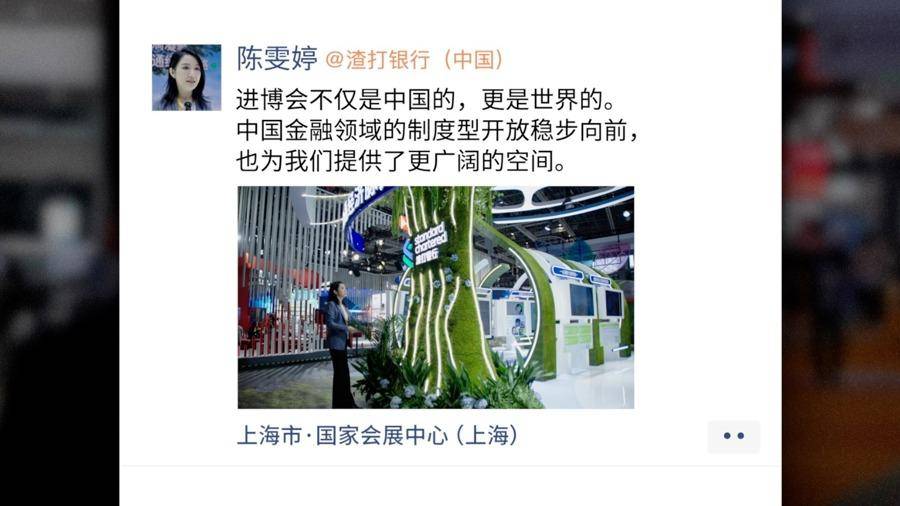 在第六届进博会现场的服务贸易展区,一座“脉络花园”于渣打银行展台建起,一棵“参天大树”矗然而立。“这是我们深扎在中国土地上的一棵‘树’,我们通过金融的‘点滴之水’,融通经济的脉络,向上生长。”渣打银行(中国)公司事务及品牌和市场部品牌总监陈雯婷说。