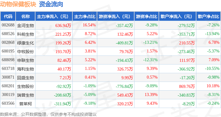 从资金流向上来看,当日动物保健板块主力资金净流入767.52万元,游资资金净流出319.87万元,散户资金净流出447.65万元。动物保健板块个股资金流向见下表: