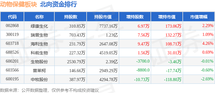 北向资金方面,当日动物保健板块北向资金持股市值为5.84亿元,增持305.05万元。其中增持最多的是绿康生化,增持了173.06万元。减持持最多的是中牧股份,减持了118.8万元。动物保健板块北向资金持股变动明细见下表: