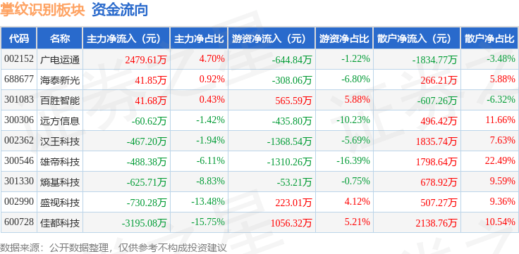 从资金流向上来看,当日掌纹识别板块主力资金净流出3004.14万元,游资资金净流出2275.78万元,散户资金净流入5279.92万元。掌纹识别板块个股资金流向见下表: