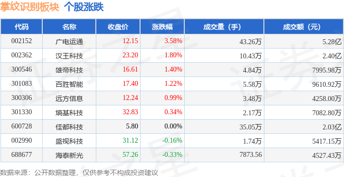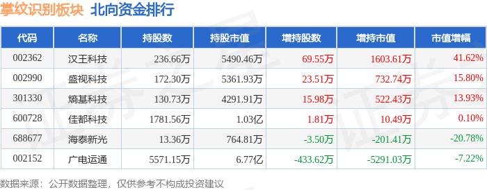 北向资金方面,当日掌纹识别板块北向资金持股市值为9.39亿元,减持0.26亿元。其中增持最多的是汉王科技,增持了0.16亿元。减持持最多的是广电运通,减持了0.53亿元。掌纹识别板块北向资金持股变动明细见下表: