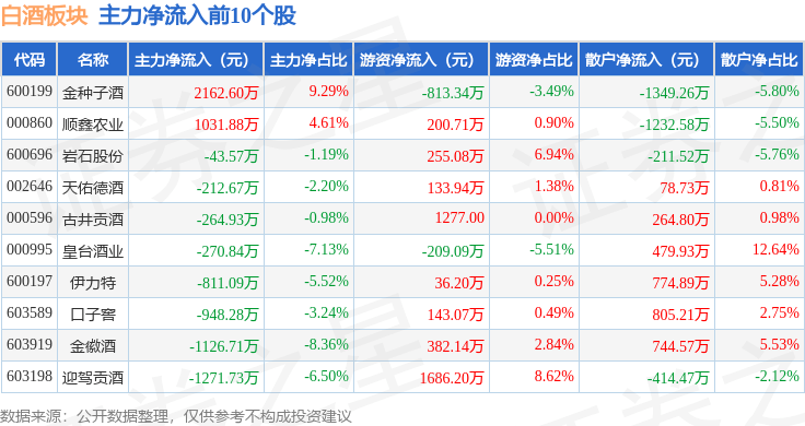 从资金流向上来看,当日白酒板块主力资金净流出7.7亿元,游资资金净流入4.43亿元,散户资金净流入3.27亿元。白酒板块个股资金流向见下表: