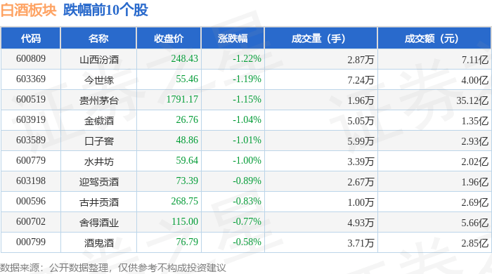 证券之星消息,11月7日白酒板块较上一交易日下跌0.89%,山西汾酒领跌。当日上证指数报收于3057.27,下跌0.04%。深证成指报收于10056.49,下跌0.15%。白酒板块个股涨跌见下表: