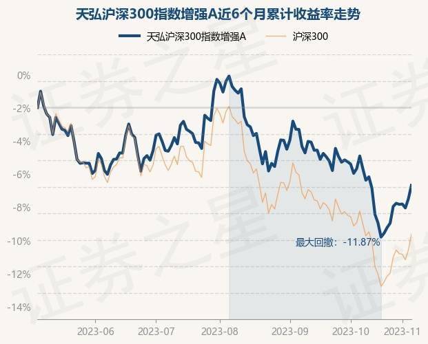 证券之星消息,11月7日,天弘沪深300指数增强A最新单位净值为1.1279元,累计净值为1.1279元,较前一交易日下跌0.27%。历史数据显示该基金近1个月下跌2.13%,近3个月下跌7.6%,近6个月下跌6.14%,近1年下跌2.76%。该基金近6个月的累计收益率走势如下图: