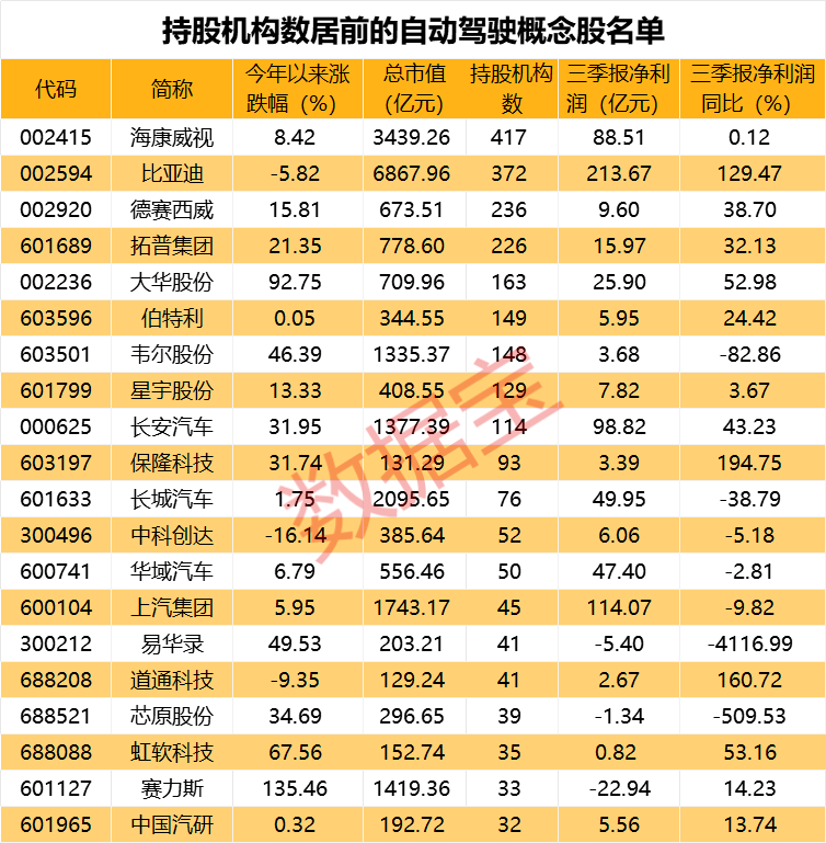 自动驾驶概念股的机构关注度较高。截至三季度末,包括海康威视、比亚迪、德赛西威、拓普集团在内的9股均获得超百家机构持股;其中海康威视的的机构持股家数多达417家,知名基金经理冯柳旗下的高毅邻山1号远望基金在三季度增持海康威视300万股,位列第四大股东。
