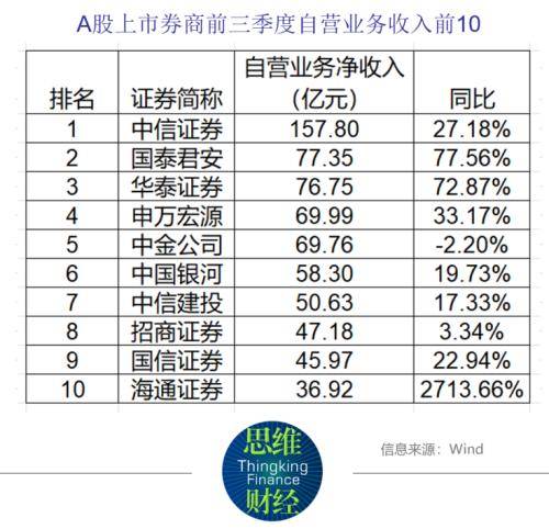总体来看,上市券商自营业务收入增长亮眼。据Wind统计,前三季度,43家券商中只有3家自营业务收入同比下滑,太平洋、招商证券分别增长1.14%、3.34%,其余券商增幅均超过10%。