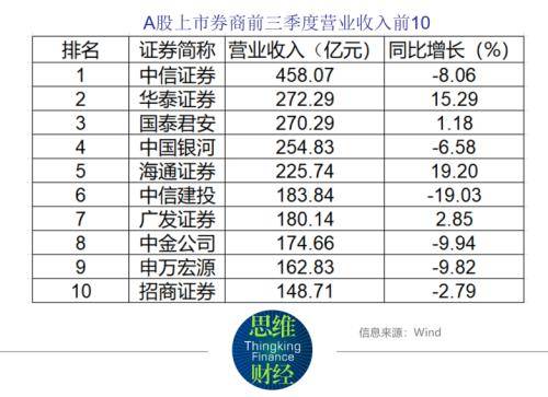 营业收入方面,43家上市券商中有13家前三季度营收达到百亿级。中信证券以458亿元一马当先,排在其后的还有华泰证券、国泰君安、中国银河、海通证券,营收也均超过200亿元。
