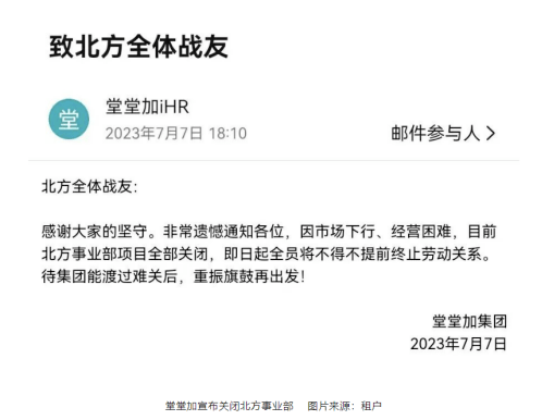 而在上述事件发生不久,今年7月,堂堂加宣布北方事业部项目全部关闭。