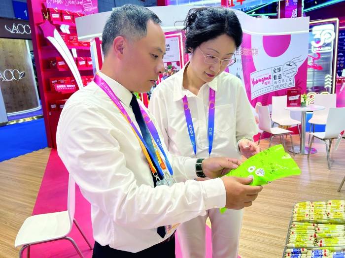 今年是来伊份董事长施永雷第六次参加进博会。当上海证券报记者与他在展馆偶遇时,他正在旗下进口品牌亚米的展台查看产品。来自韩国的大单品鳕智多系列、马来西亚的提拉米苏巴旦木黑巧克力、菲律宾的香蕉片等,吸引不少参观者驻足尝鲜。