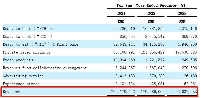 尽管用户数与品牌发展不错,但日日煮的营收数据却并不那么乐观。数据显示,公司总收入在疫情期间出现下滑,从2021年的2.05亿人民币下降到2022年的1.80亿人民币。对此,招股书解释称,收入下降主要是由于疫情影响,导致电商业务受到大规模中断。
