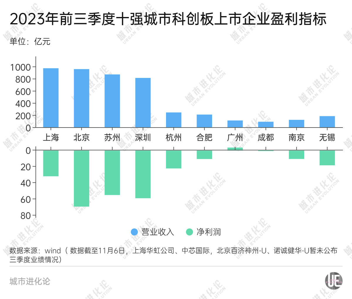 Wind数据显示,城市科创板上市企业营收规模与企业数量分布基本一致,上海、北京、苏州、深圳高居全国前四,今年前三季度营收均在800亿元以上,占据较大市场份额。杭州、合肥营收在200亿元以上,无锡、南京、广州营收在100亿元以上,同样表现较为亮眼。