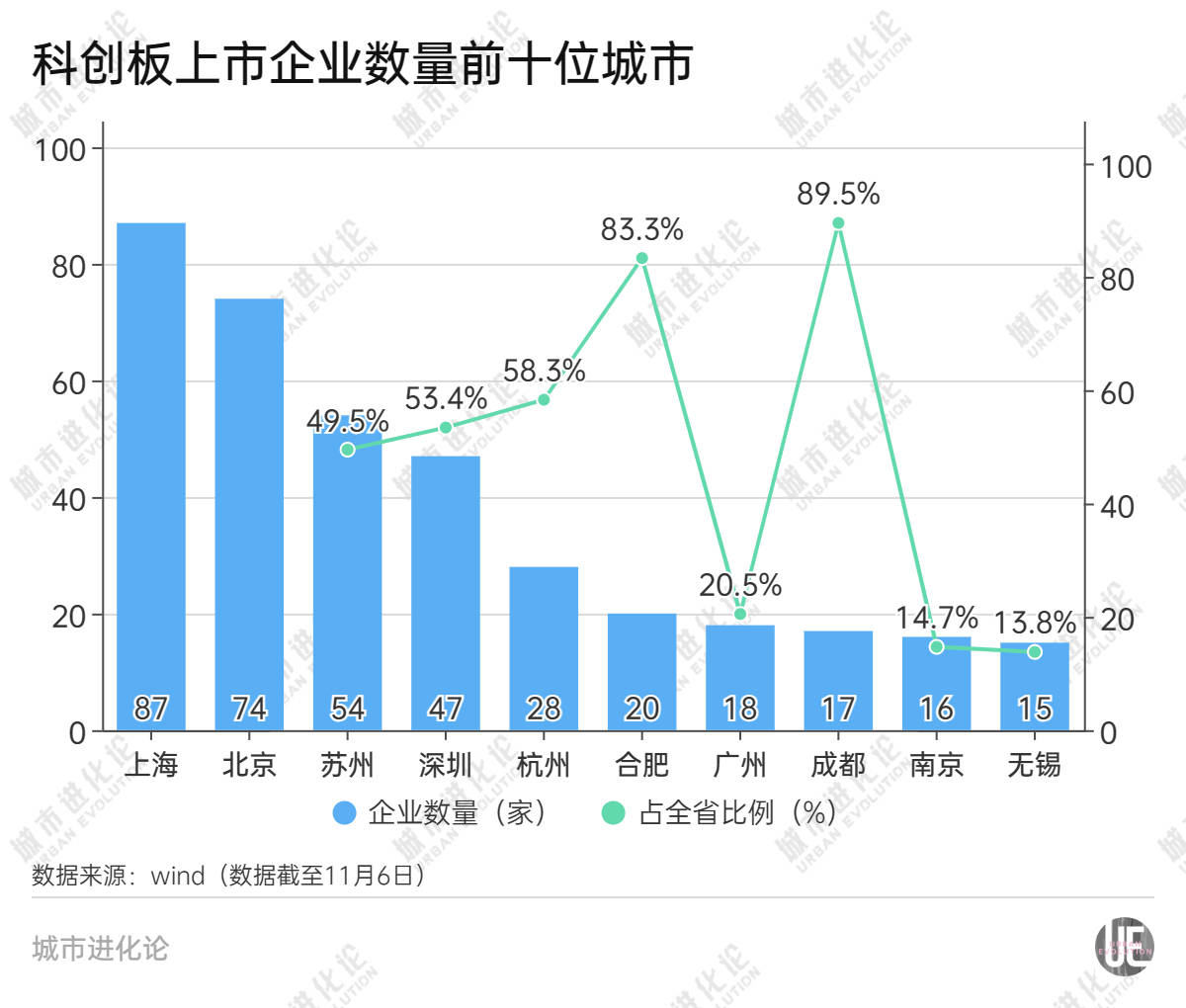 比如,Wind数据显示,截至11月6日,苏州、南京、无锡科创板上市企业数量分别为54家、16家、15家,分别占江苏49.5%、14.7%、13.8%,合计占全省78.0%;深圳、广州科创板上市企业数量分别为47家、18家,合计占广东全省73.9%。这也反映出,经济强市、产业强市是区域科创板块的主力军。