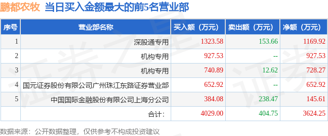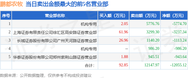 沪深交易所2023年5月29日公布的交易公开信息显示,鹏都农牧(002505)因日跌幅偏离值达到7%的前5只证券登上龙虎榜。此次是近5个交易日内第2次上榜。