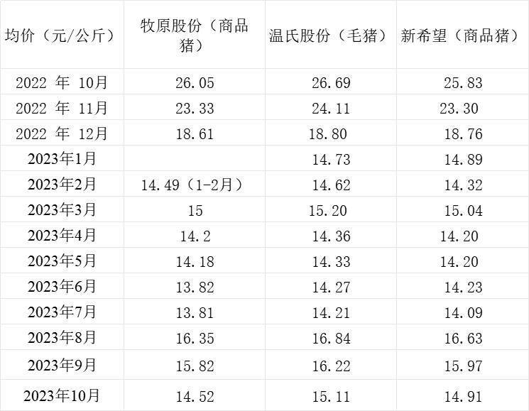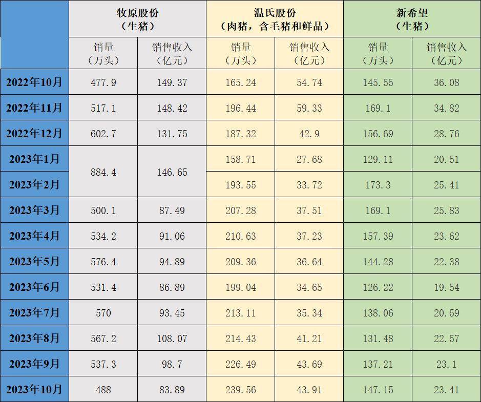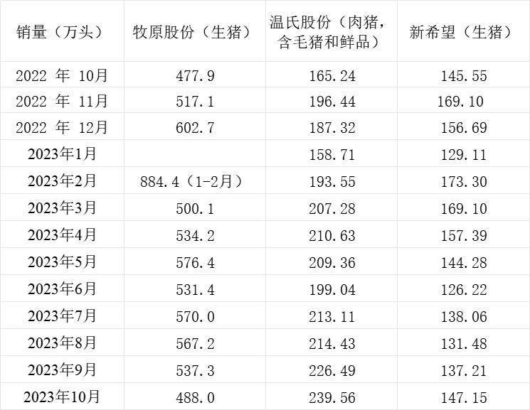 截至11月7日,三大上市猪企牧原股份(002714.SZ)、新希望(000876.SZ)、温氏股份(300498.SZ)全部发布10月生猪销售简报。