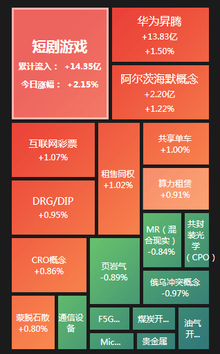 盘面上,短剧游戏、华为昇腾、阿尔茨海默概念、传媒、共享单车等板块涨幅居前,油气开采及加工、汽车整车、贵金属等板块跌幅居前。