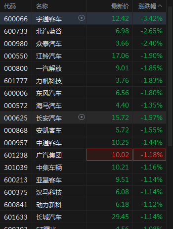 北汽蓝谷跌超2%,赛力斯跌超1%,广汽集团、东风汽车等多股下跌。